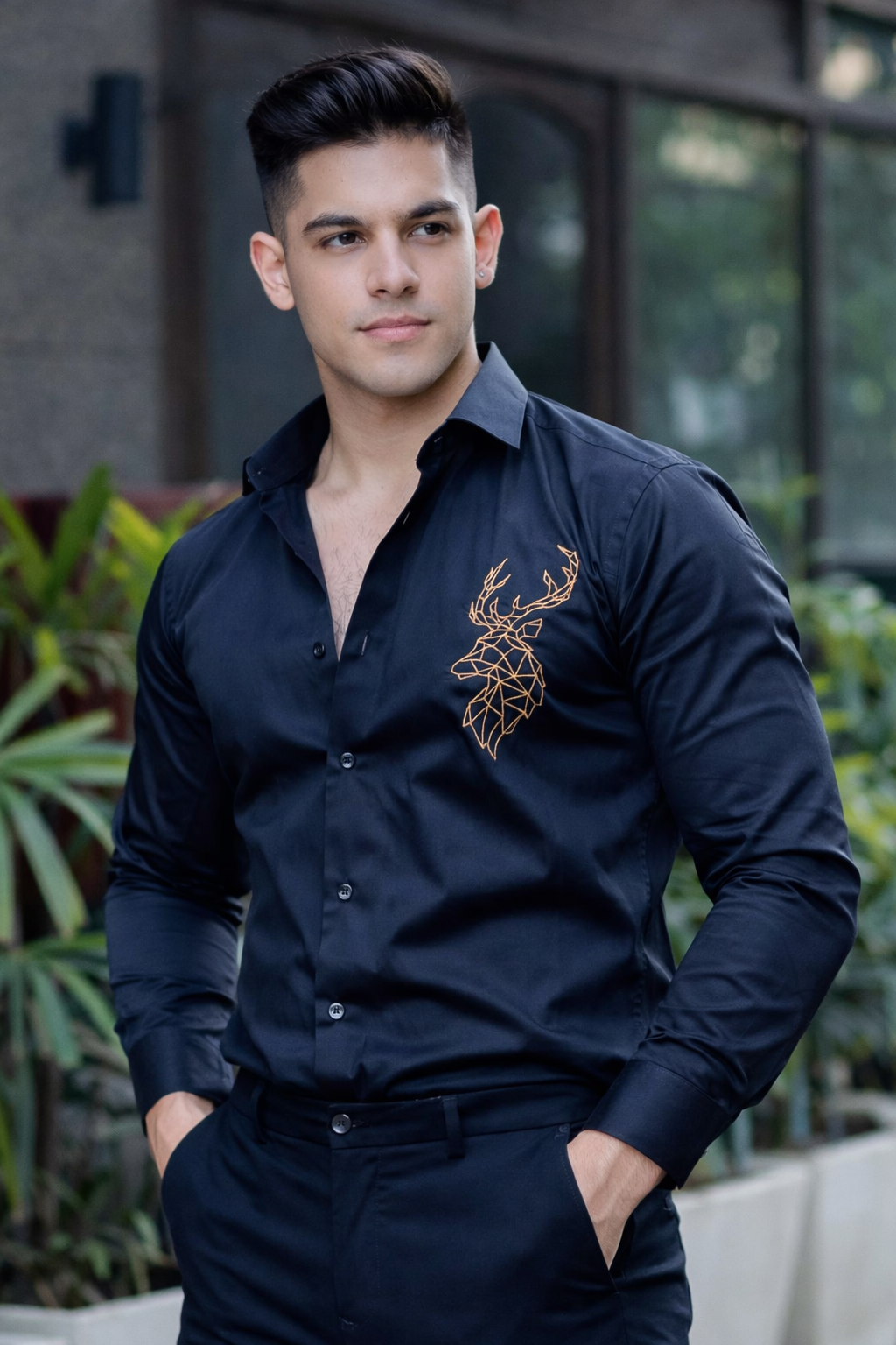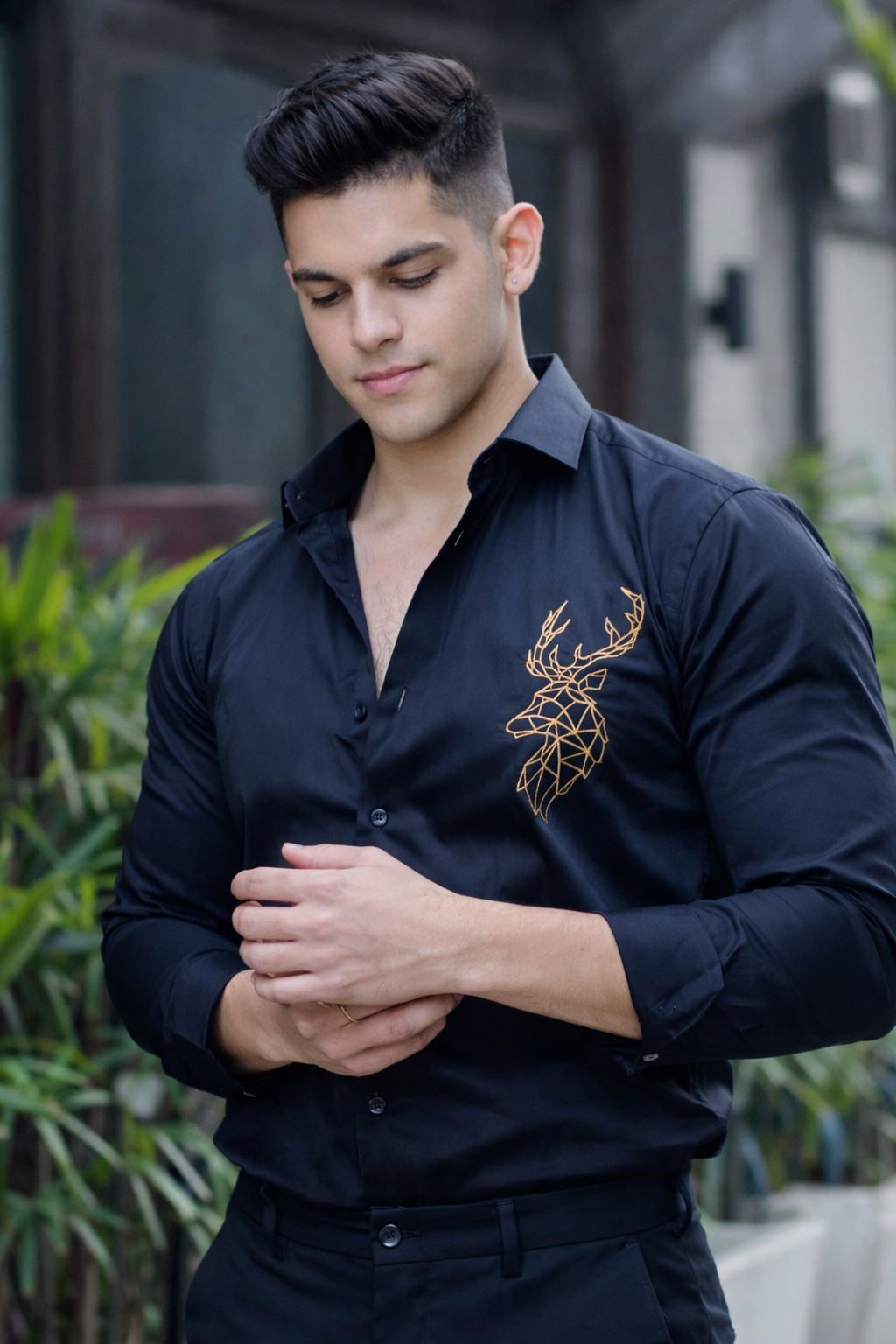 Deer Embroidered Black Premium Cotton Shirt