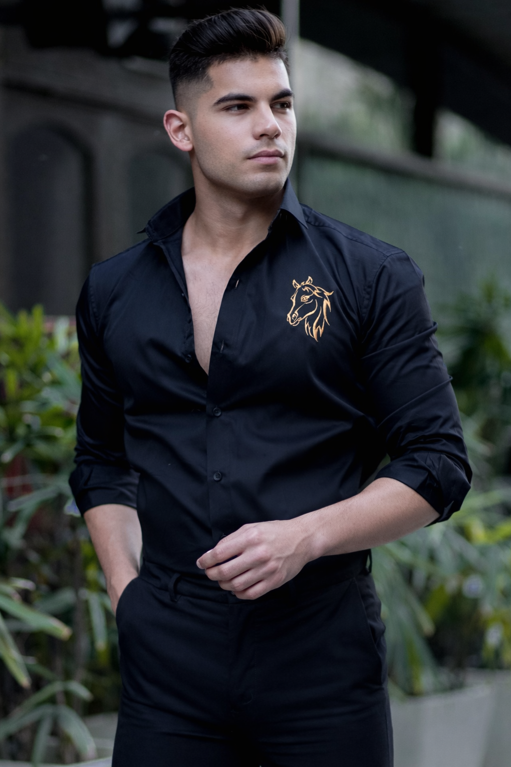 Horse Embroidered Black Luxury Cotton Shirt For Men